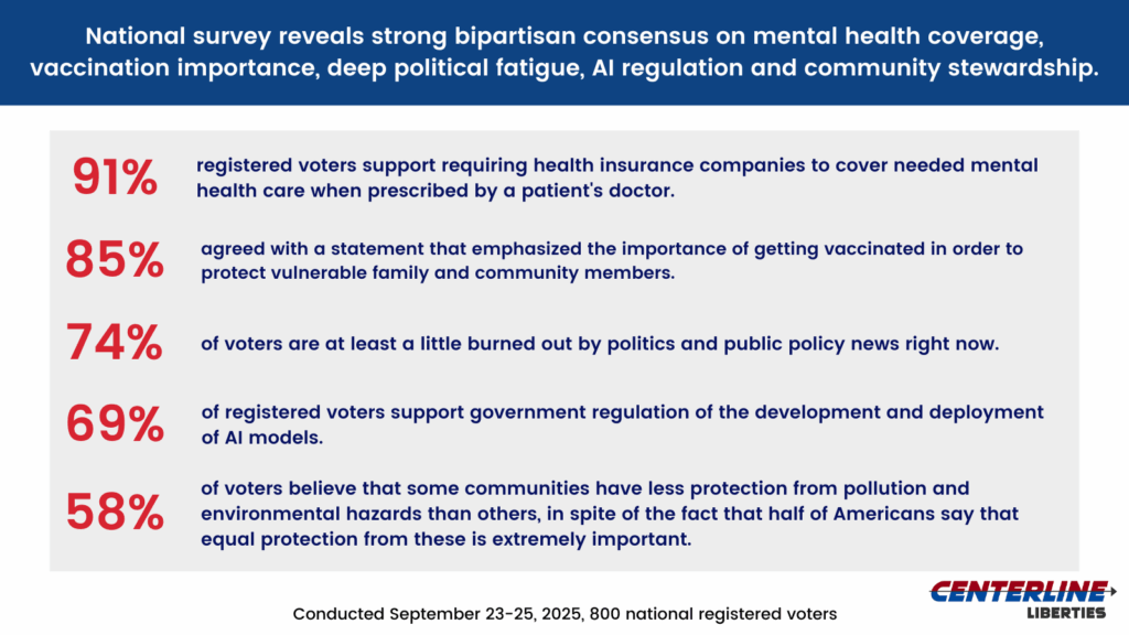 While there are some issues our country is currently deeply divided on, Alex Lundry’s nationwide survey of 800 registered voters reveals strong bipartisan consensus on AI regulation, mental health coverage, vaccination importance, and community stewardship, alongside deep political fatigue. These unifying issues that lawmakers should prioritize in the upcoming year were covered by Politico Morning Tech, and Politico Morning Pulse.